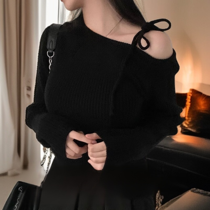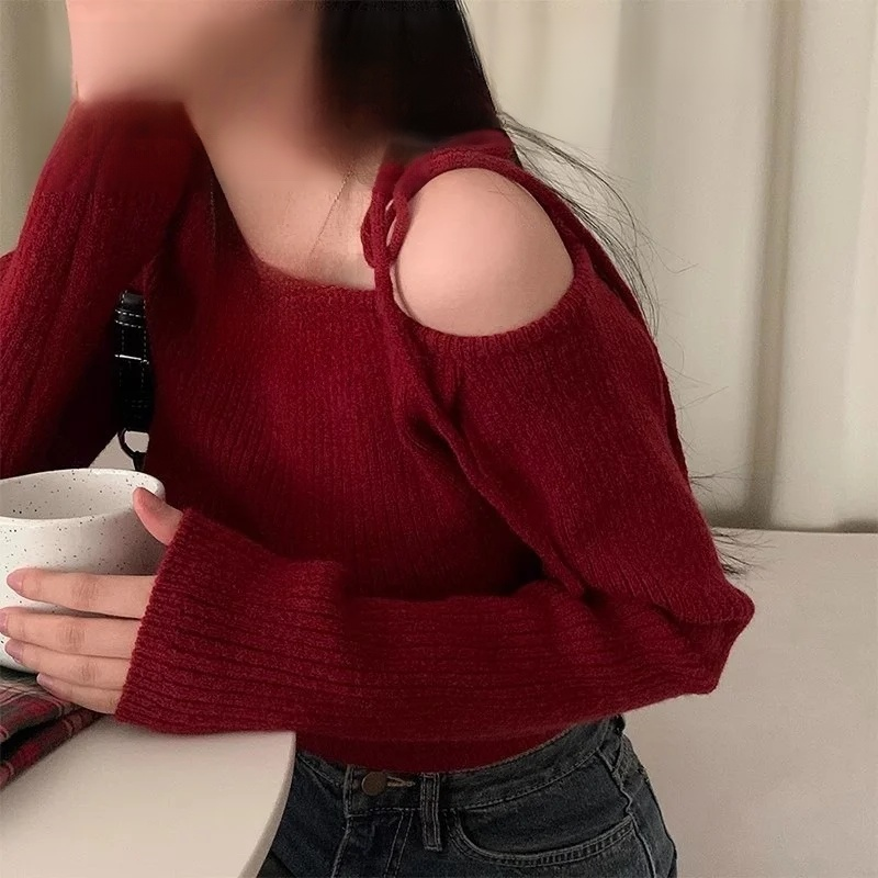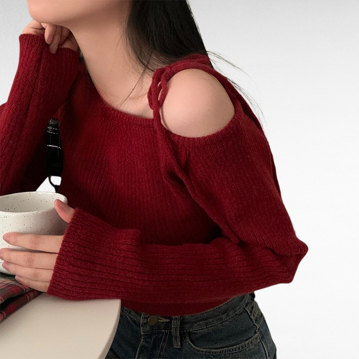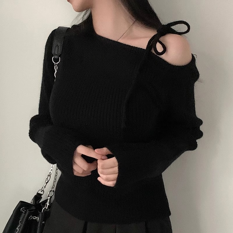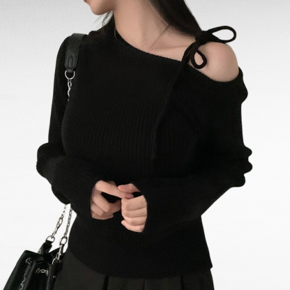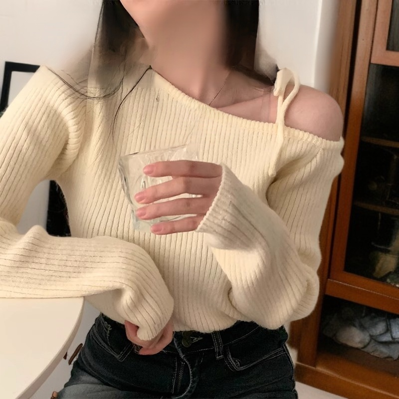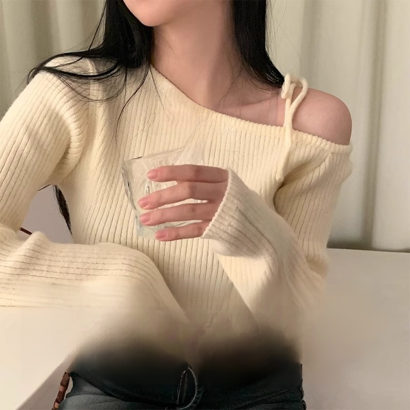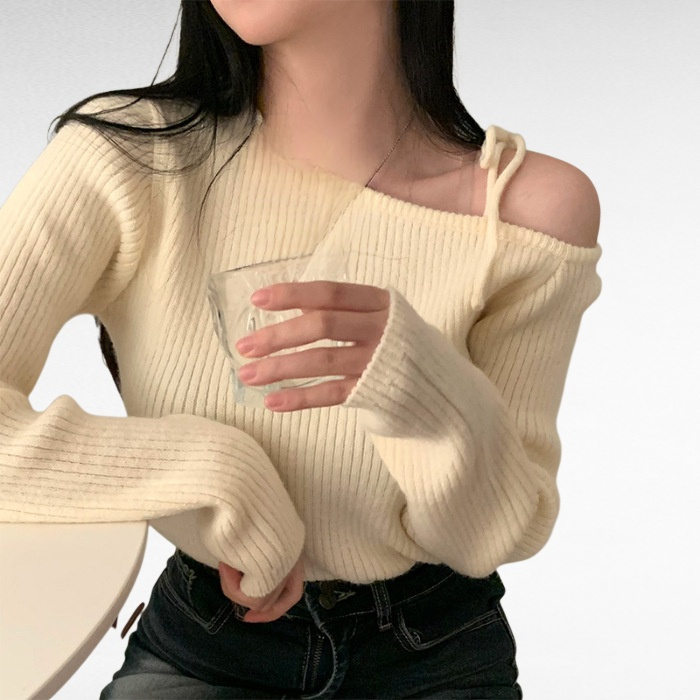 不規則斜領露肩針織衫毛衣