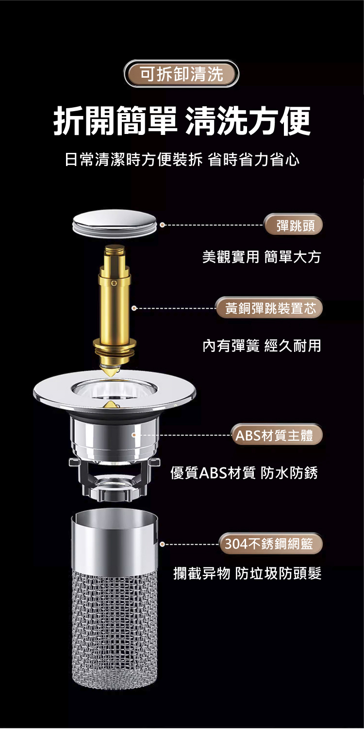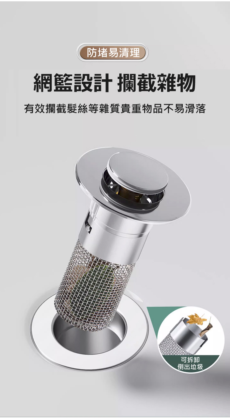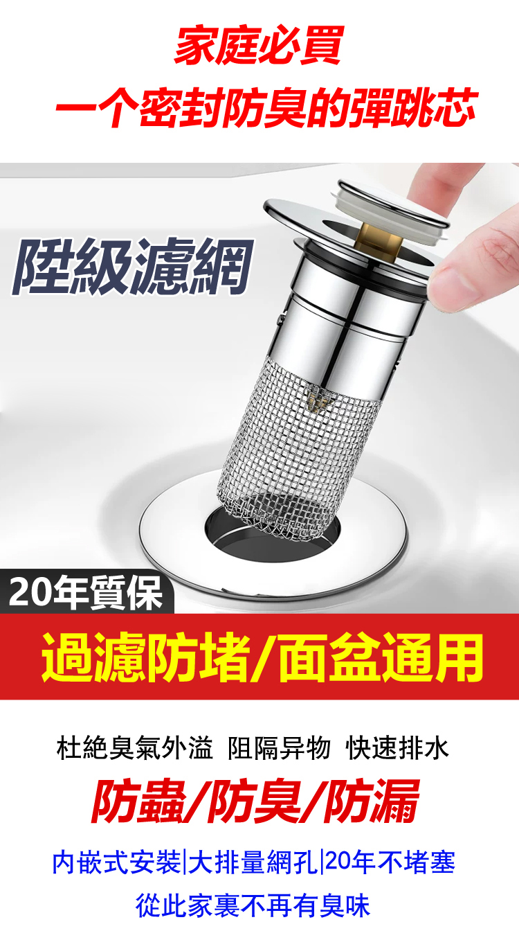 台灣熱銷 8 萬 +!家居防臭防堵萬能彈跳芯,304 不鏽鋼外殼 + 食品級硅膠密封圈,防臭率 99%、隔絕蟲鼠無死角,加密濾網精准攔截毛髮防堵塞。免工具 5 秒快裝,面盆、水槽通用,可拆卸清洗不髒手。20 年耐用不易損